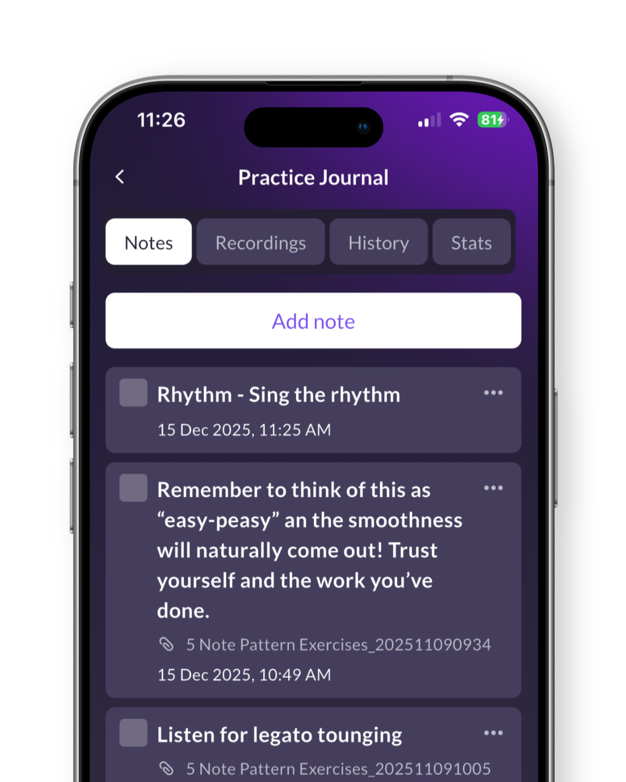 Take notes any way you want. From to-do’s to journals, Modacity™ has you covered. We’ll even display your notes right on your practice screen, so you don’t miss a beat.